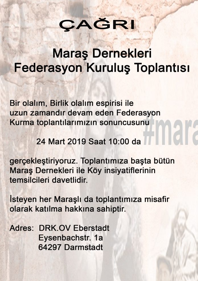 Maraş Girişimi öncülüğün de devam eden Maraş Dernekler Federasyonu Kuruluş Toplantılarının sonuncusu bu Pazar Almanya nın Darmstadt şehrinde gerçekleştrilecek.