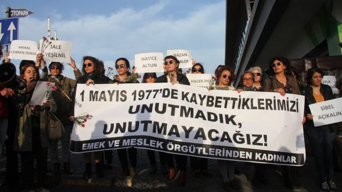 1977 kanlı 1 Mayıs’ın 42’inci yıldönümüne sayılı günler kala bir araya gelen emek ve meslek örgütlerinden kadınlar, katliamın yaşandığı Kazancı Yokuşu’nda yaşamını yitiren işçi kadınları andı. Anma öncesi Taksim Meydanı’nı etrafını ablukaya alan polisler, kadınların Fransız Konsolosluğu önünde toplanmasına izin vermedi. Bu keyfi engel üzerine kadınlar, Kazancı Yokuşu’nda bir araya geldi. Anmada, “1 Mayıs 1977’de kaybettiklerimizi unutmadık, unutmayacağız” yazılı pankart açıldı; katliamda yaşamını yitiren sekiz işçi kadının isimlerinin yer aldığı dövizler taşındı. Sık sık, “Yaşasın 1 Mayıs”, “Bijî yek Gûlan”, “Jin jiyan azadî”, “Yaşasın kadın dayanışması” sloganlarını atan emek ve meslek örgütlerinden kadınlar adına açıklamayı polis tarafından katledilen Evrensel Gazetesi Muhabiri Metin Göktepe’nin ablası Meryem Göktepe okudu.